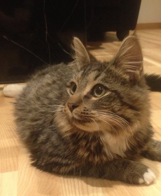 Skulle hente et bord da denne pusen dukket opp og løp etter bilen min. Det var frost ute, han hadde flere store vonde klumper i pelsen samt at han virket veldig sulten og litt for tynn. Han hoppet frivillig inn i bilen og ville ikke ut igjen, krøyp opp på brystet mitt og inn i jakken min. Jeg avgjorde derfor at det beste ville være å ta han med. Jeg vet at han har eiere et sted da han er svært tillitsfull og tam, bruker kattedo og har to barberte flekker på hver side av pelsen. Er samtidig overbevist om at han må ha vært ute en stund da pelsen var såpass skitten og flokete, i tillegg til at han spiste en hel skål med tørrfor + en porsjon våtfor og drakk en hel skål med vann når vi kom hjem. Håper eier dukker opp, er helt sikker på at denne snille og tillitsfulle kosepusen er dypt savnet!
