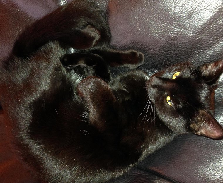 Nydelig blank sort pels. Mellomstor hunnkatt. Gule øyne. Hvit flekk på bryst og så vidt hvit flekk på mage. Ellers helt sort. Har innsatt Chip. Har dessverre kun dette ene bildet av henne. Hun er 1,5 år gammel.