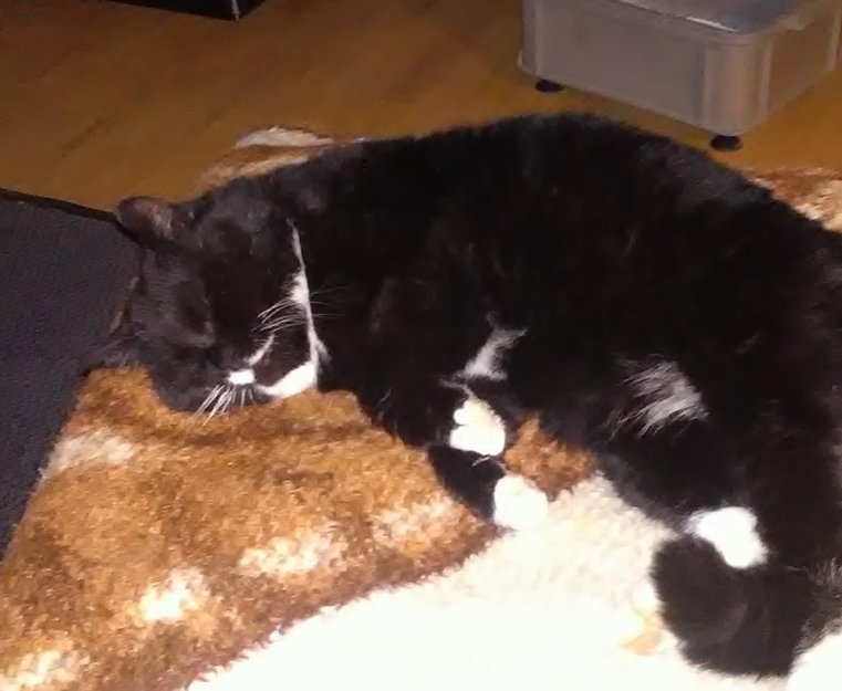 jeg er en kraftig kar på 5,5kg. har en stor hvit flekk på høyre siden over munnen og en liten hvit flekk på venstre side. hvit brystkasse, hvit flekk på magen og hvite poter. på begynnelsen av halen har jeg en tynn nesten hårløs stripe som dyrlegen sørget for at jeg fikk;(