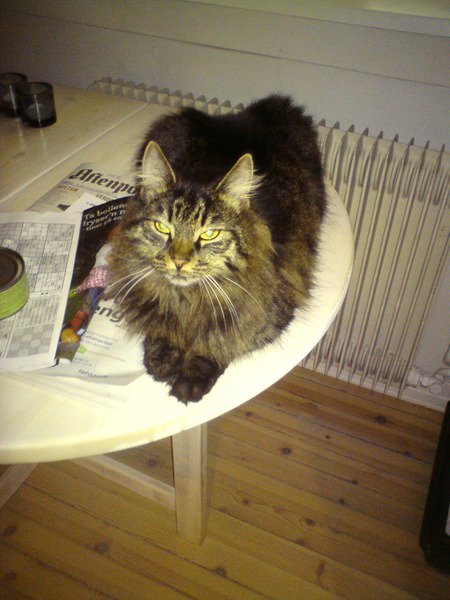 Langhåret rasekatt. Usikker på rasen, men den mangler hale. Pen i pelsen.