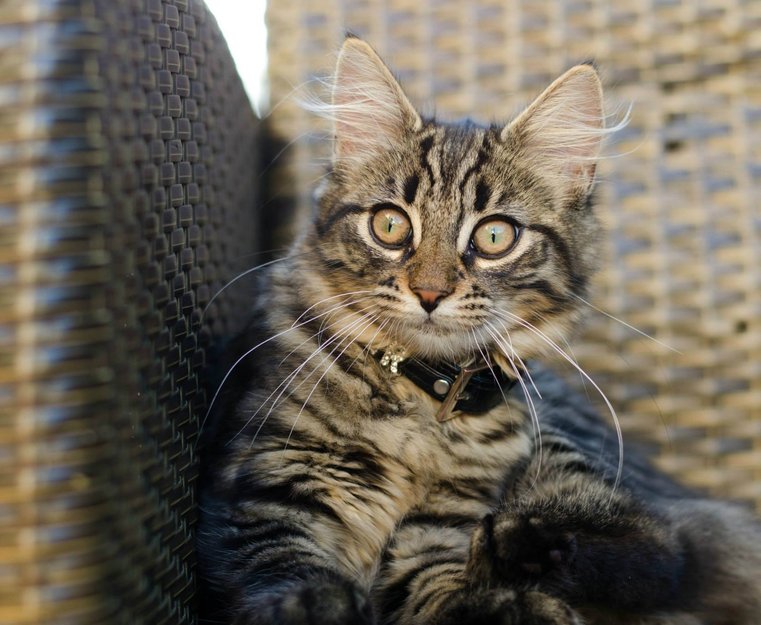 Semi-langhåret pus, men lange værhår. Hun har ørehår, som stikker ut av ørene og er stripet i pelsen. Knall-grønn sirkel rundt hver pupill på begge øynene. Korte ben, men meget lang og tykk hale. Er noe sjenert ovenfor nye mennesker.