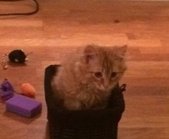 Kl 0800 i morges smatt han ut døra. Vi fant ut at han var borte Kl 1300 og lette til Kl 1530. Han har aldri vært ute alene før og det har snødd i hele dag. Han er 5 måneder.