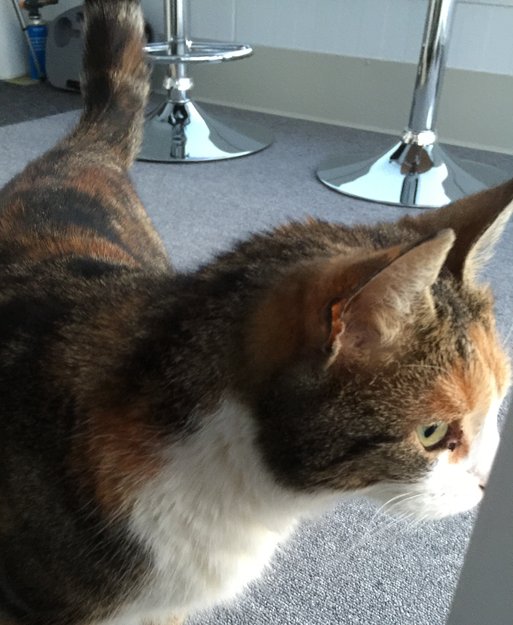 Etter at ha gått mange turer i området, fant jeg ferske kattespor utanfor en hytte som arbeidere leier. Det viste seg at Maja hadde holdt til der, fått mat og kos! Hentet henne seinare da hun kommet dit etter sin daglige spasertur. Hun kom gladelig med meg hjem igjen! Fikk en masse kos! Lykke!