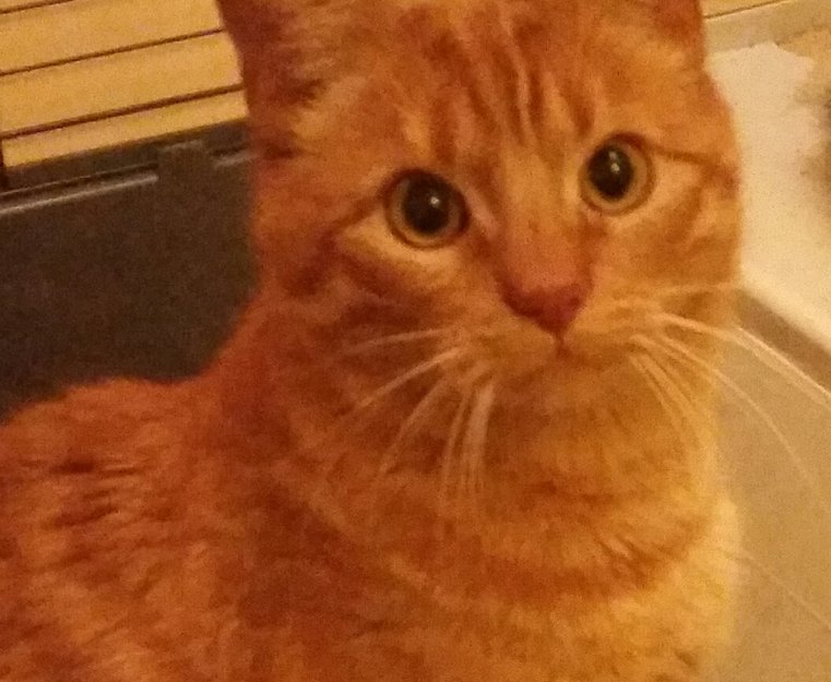 Rødstripet/tigre huskar. Store øyne, mjauer mye, kosete. Har en relativt stor pelsløs flekk på buken.
