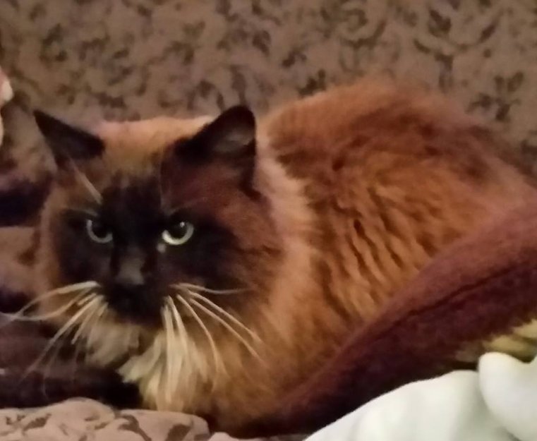 Fargen er mellombrun med rødskjær. Mørk brun maske, mørkere på labbene og hvite sokker. Hvitt felt på brystet. Litt spesielt med hvite værhår i det mørke ansiktet?