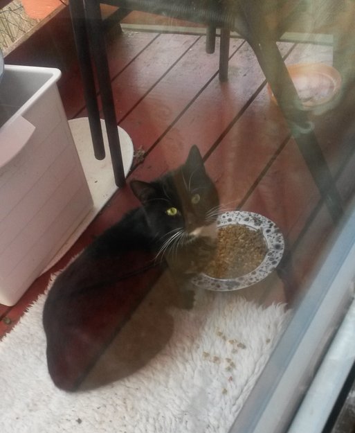 Litt hvit på haken og potene. Skvetten og holder seg på litt avstand ved mating om jeg er nær.