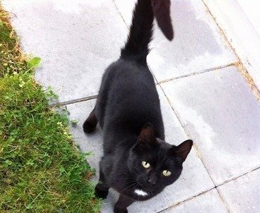 Liten katt med tynne føtter og smal hale. Svart med en hvit flekk i brystet