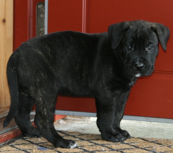 En Dogo canario hannvalp med en svartdominerende brindlet pels- lett gjenkjennelig pga den svarte fargen med hvit hake, en svært liten hvit stjerne på brystet og litt hvitt på begge potene bak.