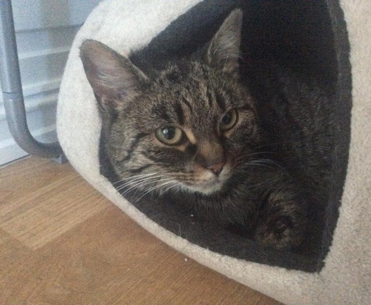Katten er korthåret, gråstripet med litt brune og hvite nyanser og er antatt ca 3 år