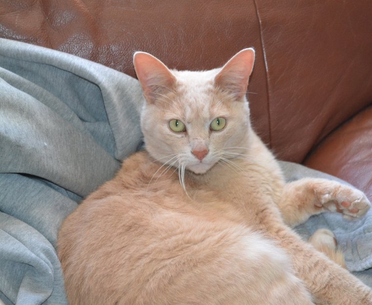 Ensfarget gul, meget smalt hode, noe stripete på halen. Meget kjærlig.