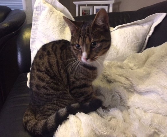 Katten sprang rett inn i huset vårt da vi åpnet døren,og ville ikke ut igjen.Hun var kald og sulten.Det var mørkt og snødde ute og var meldt minusgrader i løpet av natten, så vi bestemte oss for å la henne sove inne hos oss i natt og ga henne mat.Dette gjør jeg aldri ellers, men pga kulden og desperasjonen katten viste bestemte jeg meg for å ta vare på henne til jeg klarte å finne eierne. Hun er veldig kosen og vandt med barn.