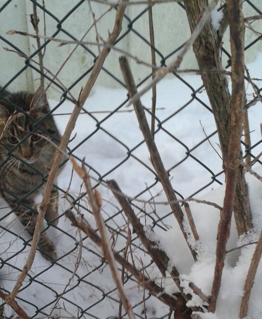 Katten satt å spiste brød som jeg gir til fuglene for ca tre uker siden. Den dukker opp hver dag mellom klokken 13-16.30. I en periode var det også en annen ukjent katt her. Nå er det kun denne katt som er her daglig. Er dette en sulten nabokatt som bor i nærområdet på Tåsen.