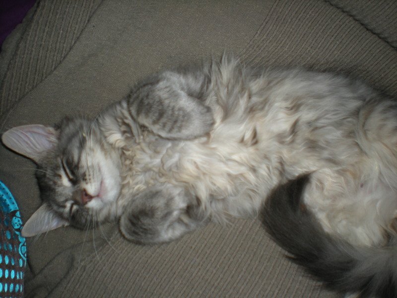 Pixie er grå med hvitere område på magen. Hun har brune områder i pelsen. Hun er semi langhåret. Stor mørk hale.