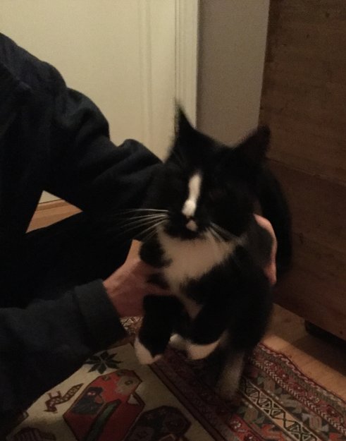 En middels stor pus som er mest sort med noe hvitt i pelsen. Den har hvite poter, hvit over snuten og hvit under magen. Pus er ikke avmagret, veldig kosete og spiser masse(åpenbart sulten)