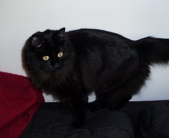Helt sort langhåret pus med gule øyne. Han er veldig sky og redd mennesker. Har ingen halsbånd, men er chippet.