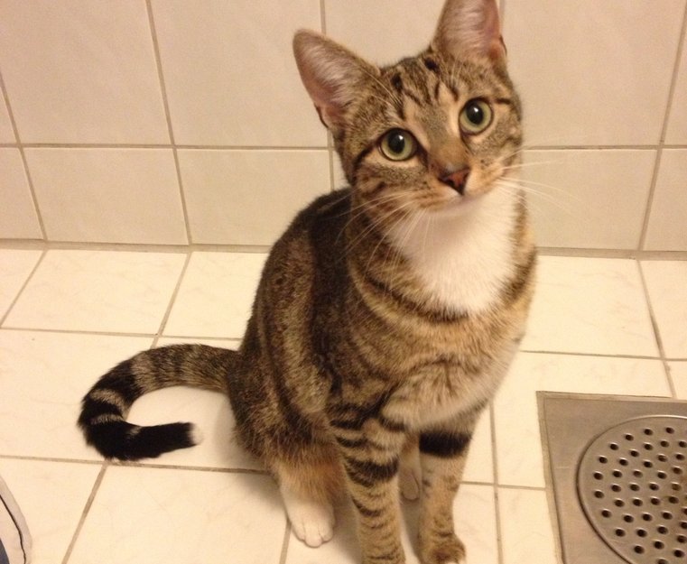 Pusungen er spraglete med litt kvitt på bryst, mage, potar og haletupp. Ho har ein pitteliten kvit strek på snuten. Ho har store, sirkelforma mønster i pelsen og ho har ein tydeleg "M" i panna. Ho er spinkel, ikkje fullvaksen enda. Pusungen er litt over eit år gamal.