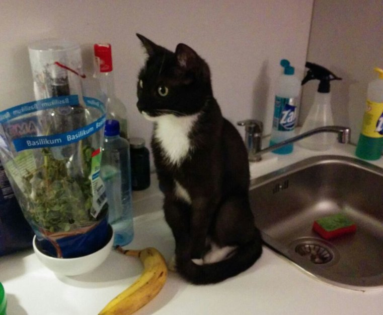 Hon är en liten pus, ser ut att vara en kattunge, utan halsband. Hon är svart med vita tassar och hals, och gula ögon.