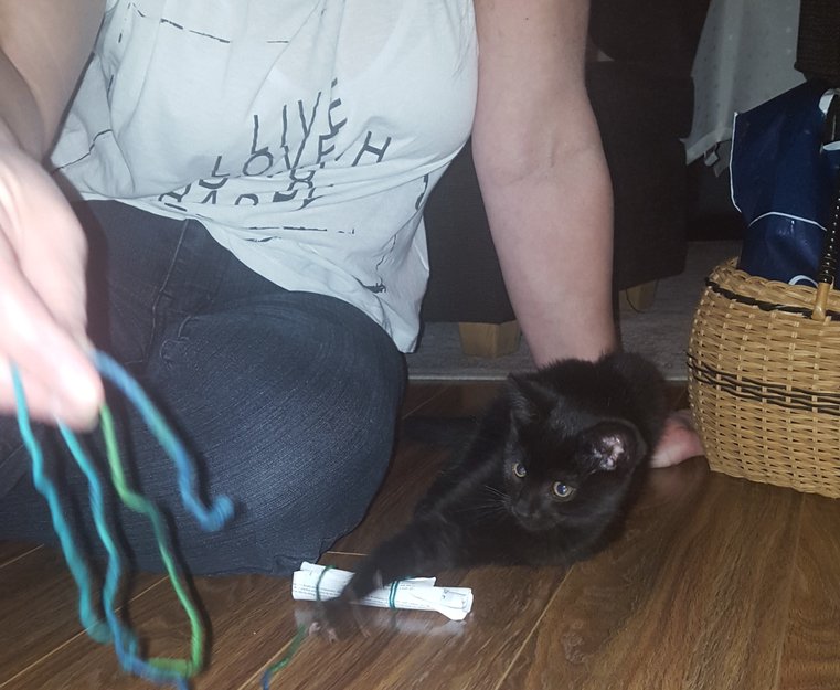En nabo kom bort til oss med denne lille kattungen. Han hadde stått utfor hos dem å jamret å mjauet. Siden han har hund så vi oss nødt til å ta katten inn.