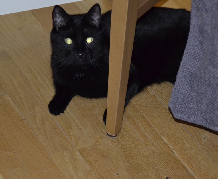 Krille har hvite hår på brystet, det er ikke en flekk. Sees kun når man har katten på nært hold. Han er forholdsvis stor, og ser helt svart ut på avstand men kjempe lang hale.