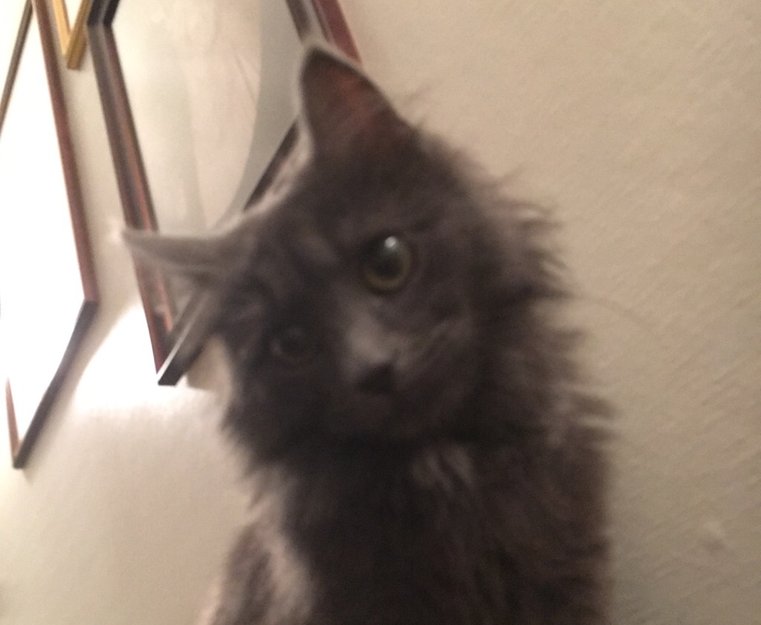 Grå med hvit flekk på bryste.lang tykk hale. Veldig redd for mennesker. Ca.6 mnd. Gammel