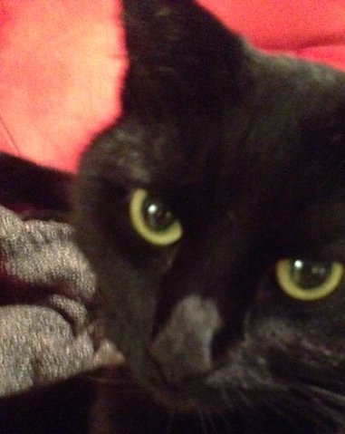 Snips er sort med litt hvit på halsen og rundt tissen.