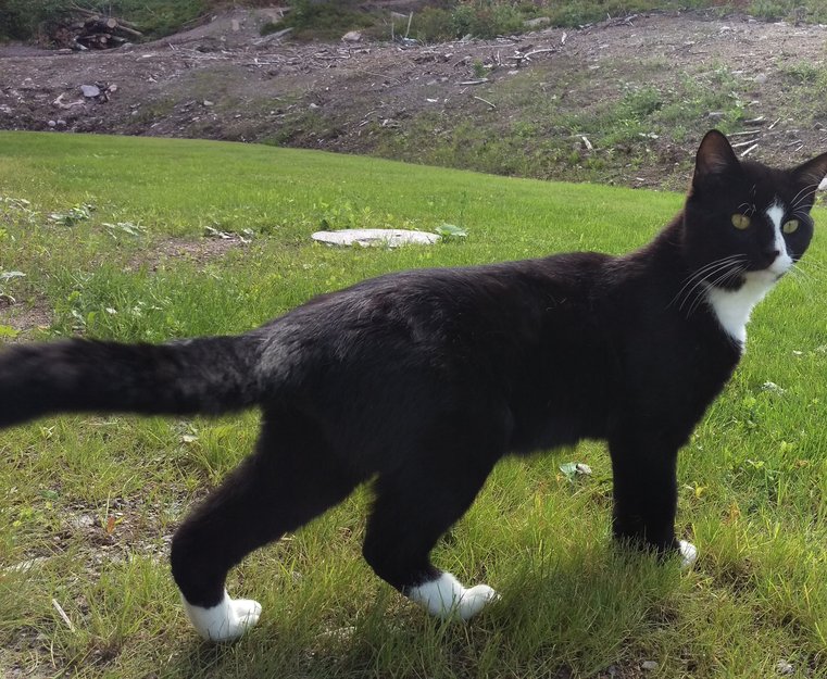 Kraftig 2 år gammel hannkatt, ca 6 kg ved siste veiing. Svart med hvite sokker, hvitt bryst, samt litt hvit nedover magen.