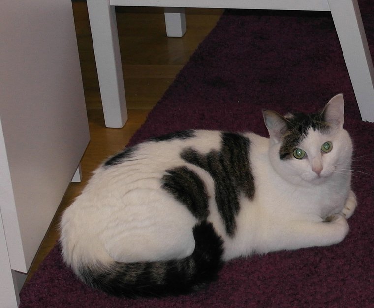 Alex er en mellomstor kastrert hannkatt, noe overvektig. Han er kjelen, men er nok litt redd.