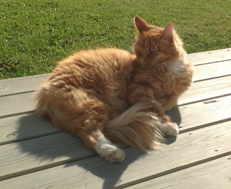 Mio er langhåret m dyp orange-rød spraglete pels, med hvite poter og bryst.