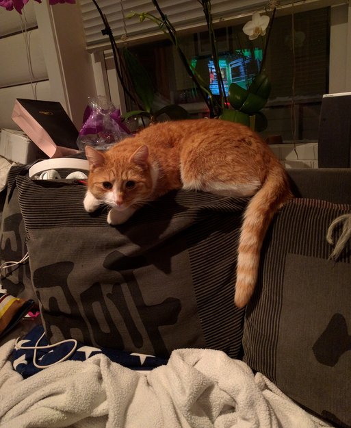 Han er litt skeptisk, liker ikke plutselige lyder. Veldig på vakt når han er ute. Han er en hvit og oransje stripet Tabby. Mye hvit på brystet og potene. Han er chippet og sterilisert.