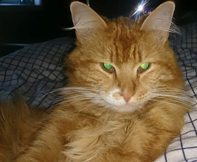 Rød og litt hvit kastrert hannkatt, øremerket og chippet. Han er ganske stor av størrelse, glad i mat. Man kan kjenne han igjen på den hvite ringen rundt nesepartiet.