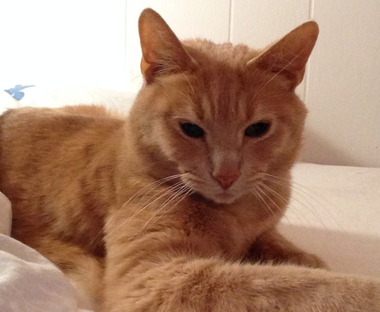 Posse har en litt lysere oransjefarge enn det du nå kan se på bildet, som han har fått etter årene. Bildet ble tatt for 1 år siden, han er nå 5/6 menneskeår. Øynene hans er veldig lyse grønne og står godt frem, nydelige. Han har ingen spesielle kjennetegn som er annerledes, annet enn at han er veldig kosete, lite aktiv og mjauer en del når han ikke får kos :)
