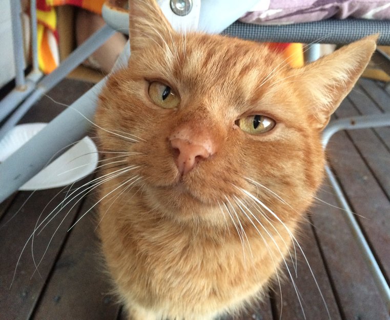 Ukastrert hannkatt har slått seg ned på verandaen vår. Han var veldig sulten så tipper han har gått ute en stund. Han er kosete og snill så håper noen savner han.