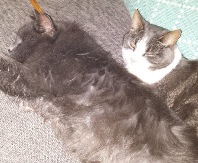 Troy er en stor, langhåret grå hannkatt, Trixi er mindre, korthåret, grå og hvit. Disse kattene kan være noe sky, men er vant til å bo hos mennesker.