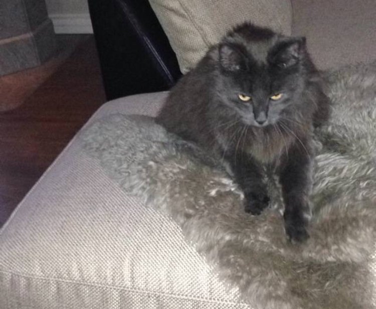 Grå langhåret skogskatt. Har en knekk på ytterste del av halen. Han er veldig kosete av seg