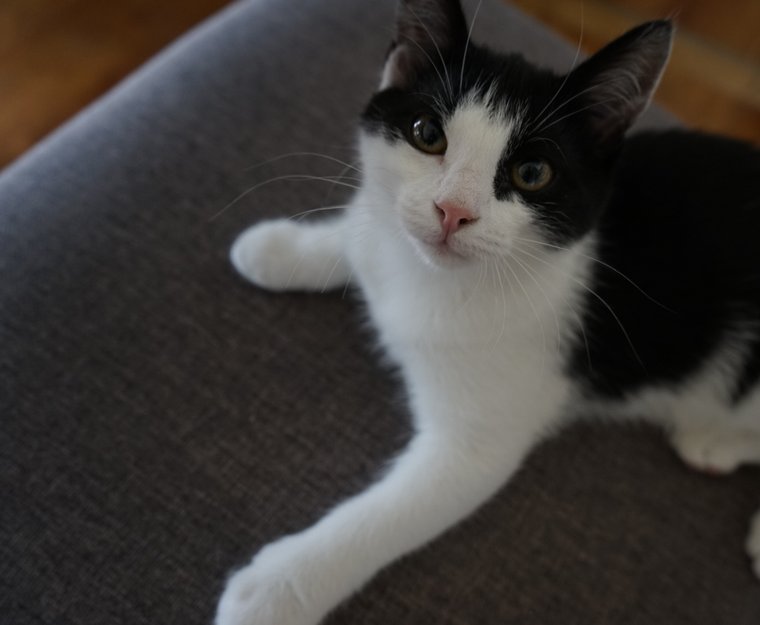 Svart og hvit. Ganske smal i ansikt og kropp. Under den ene poten stikker det litt ut på den ene siden. Etter en tidligere skade