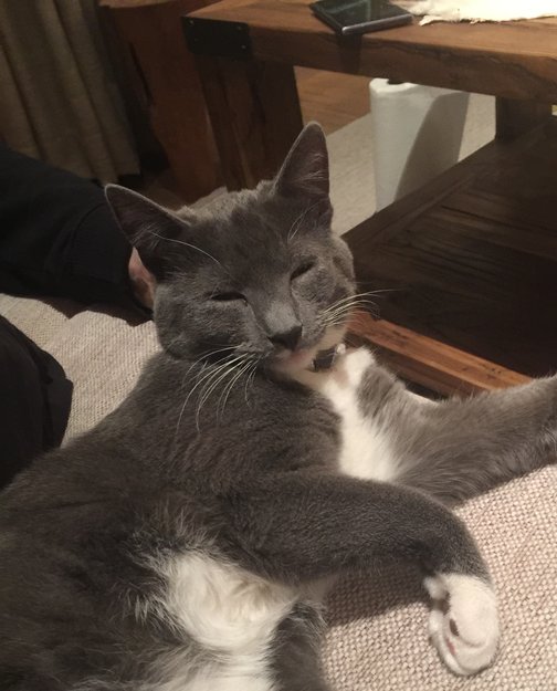 Har hvite "kne beskyttere" bak på potene. Har også hvite poter. Er hvit på brystkassen og under på magen