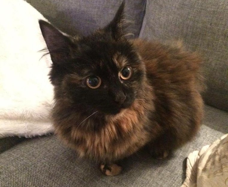 Brun og svart i pelsen. Brune øyne. Dyrlegen sa det var en ganske ung katt.