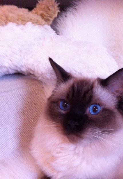 Mørk brun farge i ansikt, ører, poter og hale. Is blå øyne.