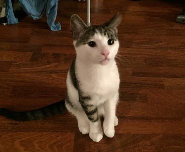 Hvit i ansikt, bryst, mage og bein. Grå-stripete på høyre forbein, oppover til ryggen og på toppen av hodet/ører. Halen har grå og svarte striper.