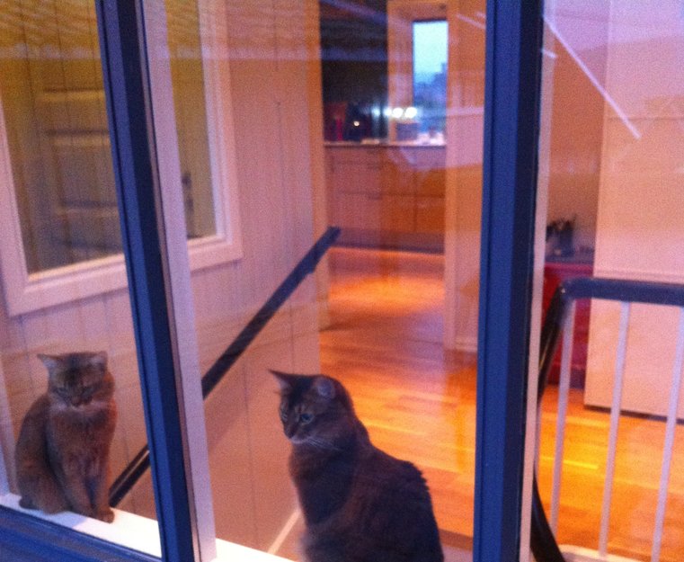 Katten satt på trappa i morges. Han var sulten, tørst og redd. Det tyder vel på at han har sneket seg inn et sted og så blitt innestengt. Så har noen kommet hjem fra vinterferie, pus slapp ut og sprang hjem.