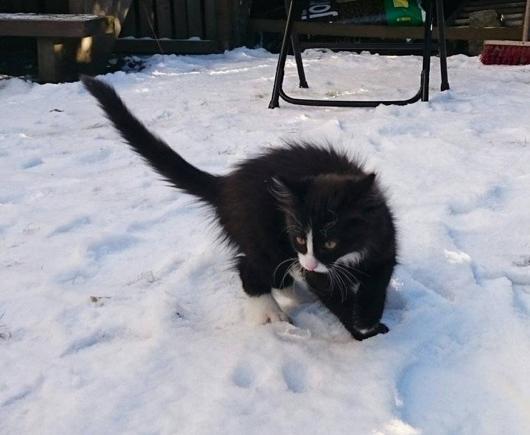 Katten vår, en 6 måneder gammel svart, langhåret katt med hvit stjerne i ansiktet forsvant søndag ettermiddag.