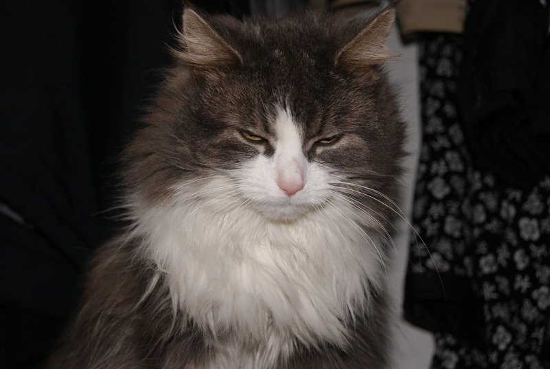 Hun er en liten,langhåret,hvit og grå.Med rosa nese.