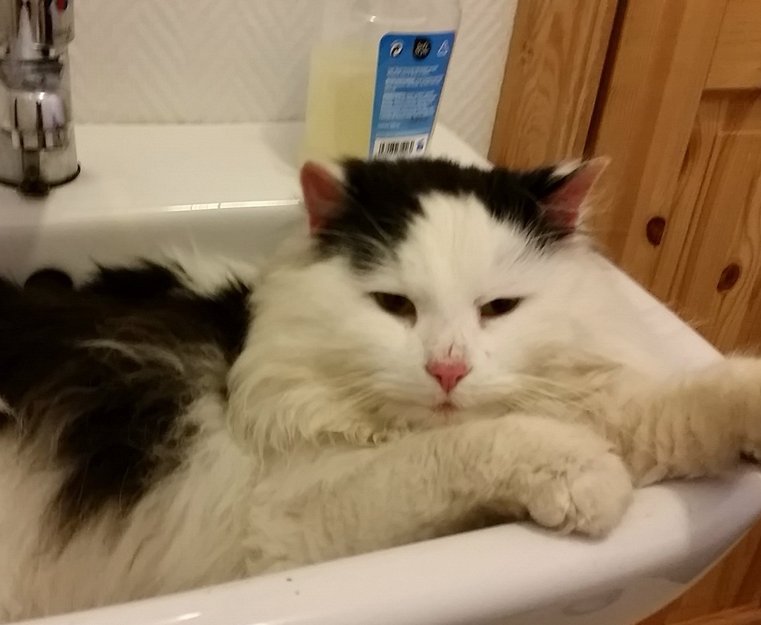 Langhåret ukastrert hannkatt. Hvit med sorte tegninger. Gule øyne med litt grønn innerst ved pupillen. Refleks halsbånd med bjelle på. Skipskatt, det vil si en ekstra tå på hver fot. Han er utrolig kjælen.