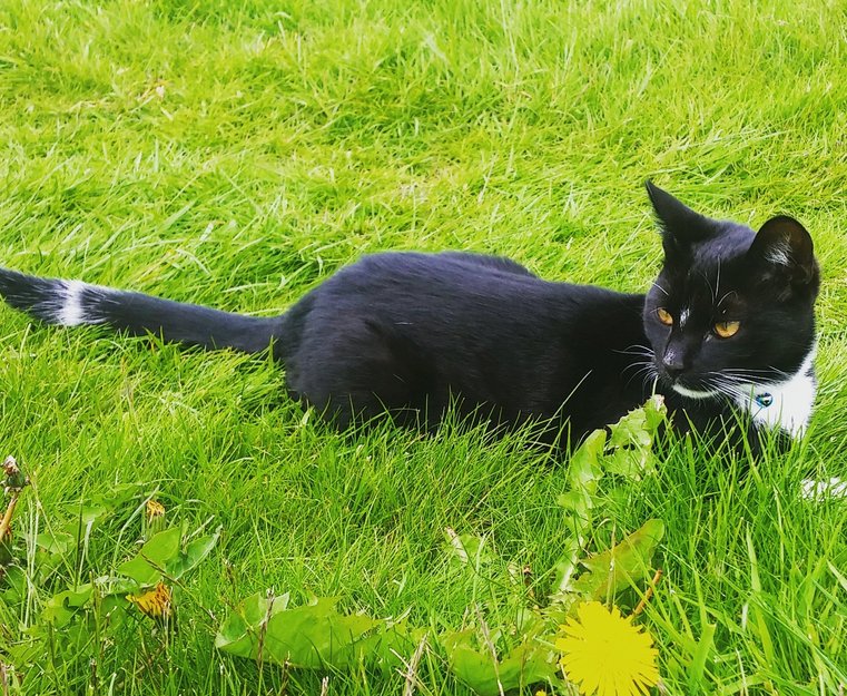 Har endelig kommet til rette! Han sto utenfor døren vår og mjauet, var kjempe sulten og kosete!