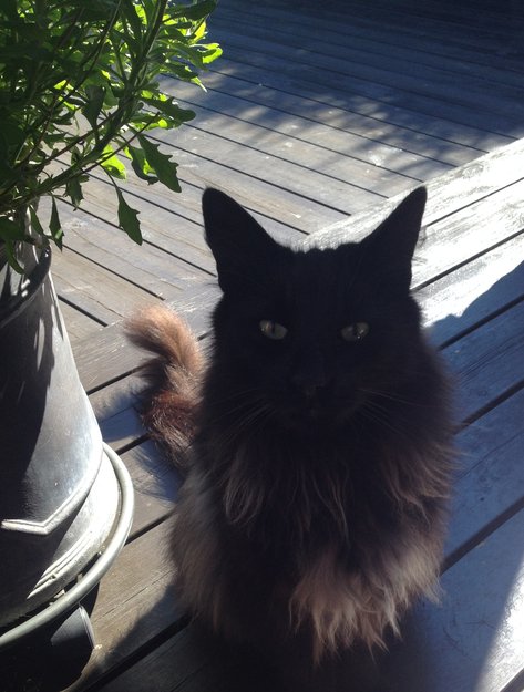 Har nå veldig mye og tykk pels med en tydelig løvemanke. Han er svart med noen mørkebrune partier i pelsen. Han har blitt litt grå på brystet. Veier ca 5 kg. Har er tatovert i øret, men dette er veldig utydelig. Snakker veldig lite, men kan gi fra seg en liten pipelyd når man snakker til han. Han hører på navnet sitt. Liker ikke snø, har det best inne.