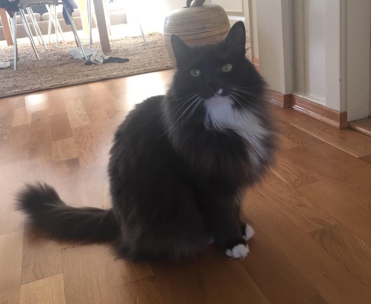 Langhåret skogskatt med hvitt bryst og hvite poter. Gråbrun pels. Hun er vanligvis litt sky og forsiktig.