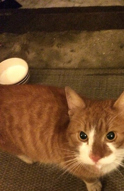 En katt har dukket opp på gården, og den er tydelig vant til å være inne. Ser ut til å ha vært ute en stund.