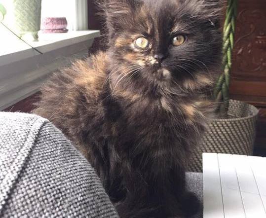Mørk katt, med lysere flekker. Har en lys flekk under leppa og ved siden av nesen. Er halv skipskatt, så har 1 ekstra klo.