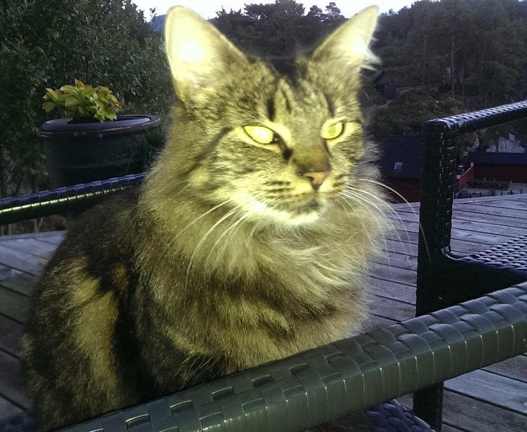 5 år gammel hannkatt i vanlig størrelse, forholdsvis kraftig pels, spesielt halen og rundt hals. Litt lysere pels under magen. Den er ID merket/ chippet med tatovert merke i ene øret.