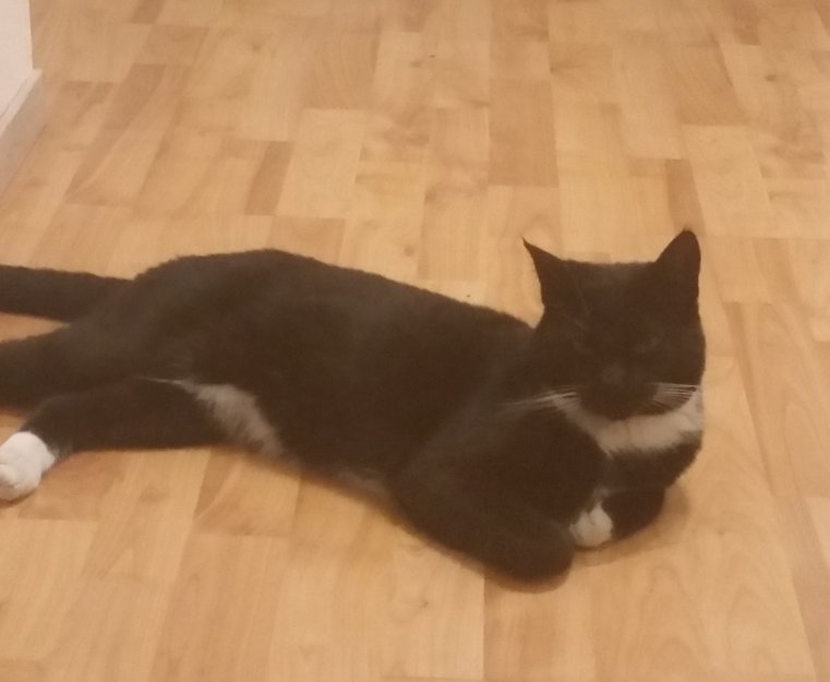 Balder er en korthåret svart katt med hvite poter, og hvit haletupp.
